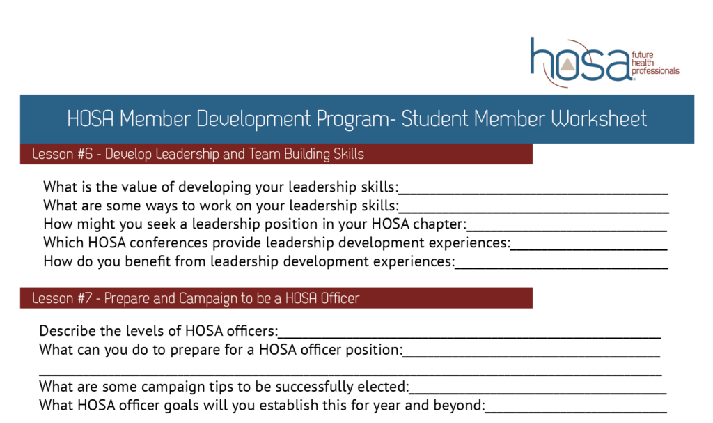 HOSA members, you are invited you to watch the following videos as part of the Top 10 Things HOSA Members Should Know Series. After viewing, complete the accompanying two-page worksheet. The worksheet questions reinforce the lessons from each video and help you apply them to your HOSA journey. Be thoughtful and thorough—this activity is meant to strengthen your understanding and prepare for success in the launch of your HOSA experience.